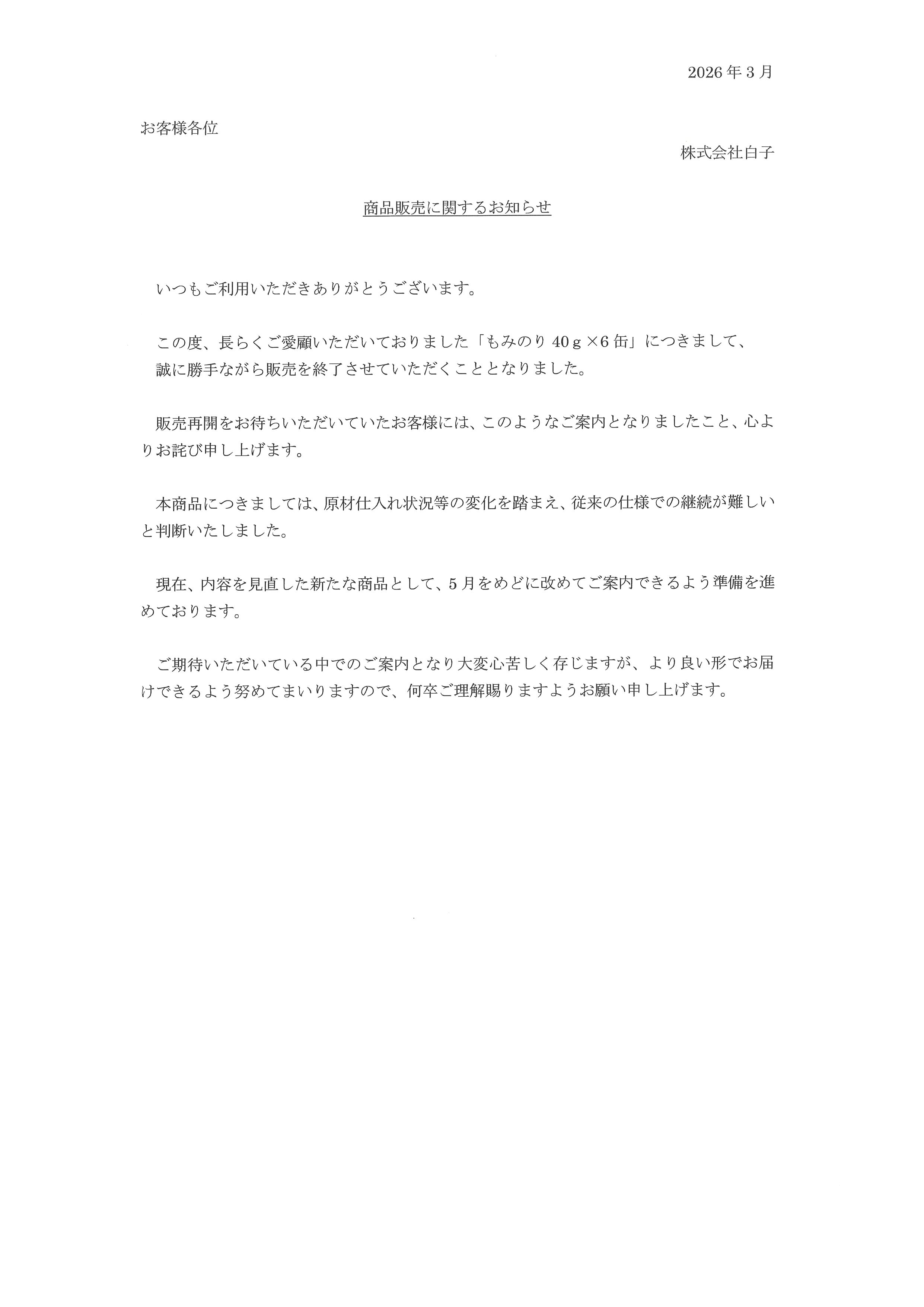 お知らせ NEWS一覧 2026.03.27 誠に勝手ながら「もみのり40g×6缶」販売を終了させていただくこととなりました。販売再開をお待ちいただいていたお客様にはご迷惑をおかけいたしますこと謹んでお詫び申し上げます。後継品は5月頃にお知らせできる予定です。【ご案内はこちら】 NEW 2025.01.07 現在、Gmailをはじめとする一部のメールアドレス宛に、弊社の自動返信メールが届かない事象が発生しております。このため手動で返信させていただいており、通常より返信にお時間を頂戴していることをお詫び申し上げます。 NEW